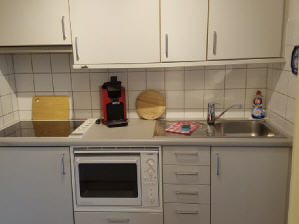 Herd und Mikro,komplett eingerichtet mit Geschirr, Geschirrtücher und Spülmittel.