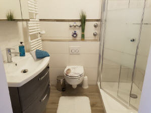 Bad mit Dusche und WC, Handtücher und Fön.